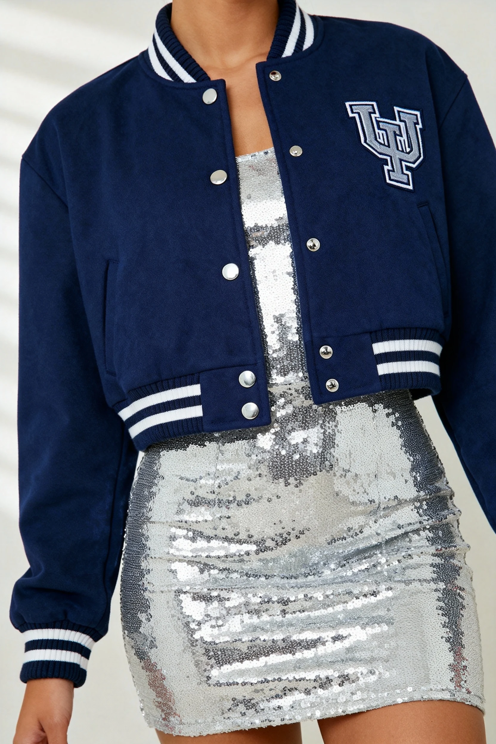 2. Silver Sequin Mini + Cropped Varsity Jacket